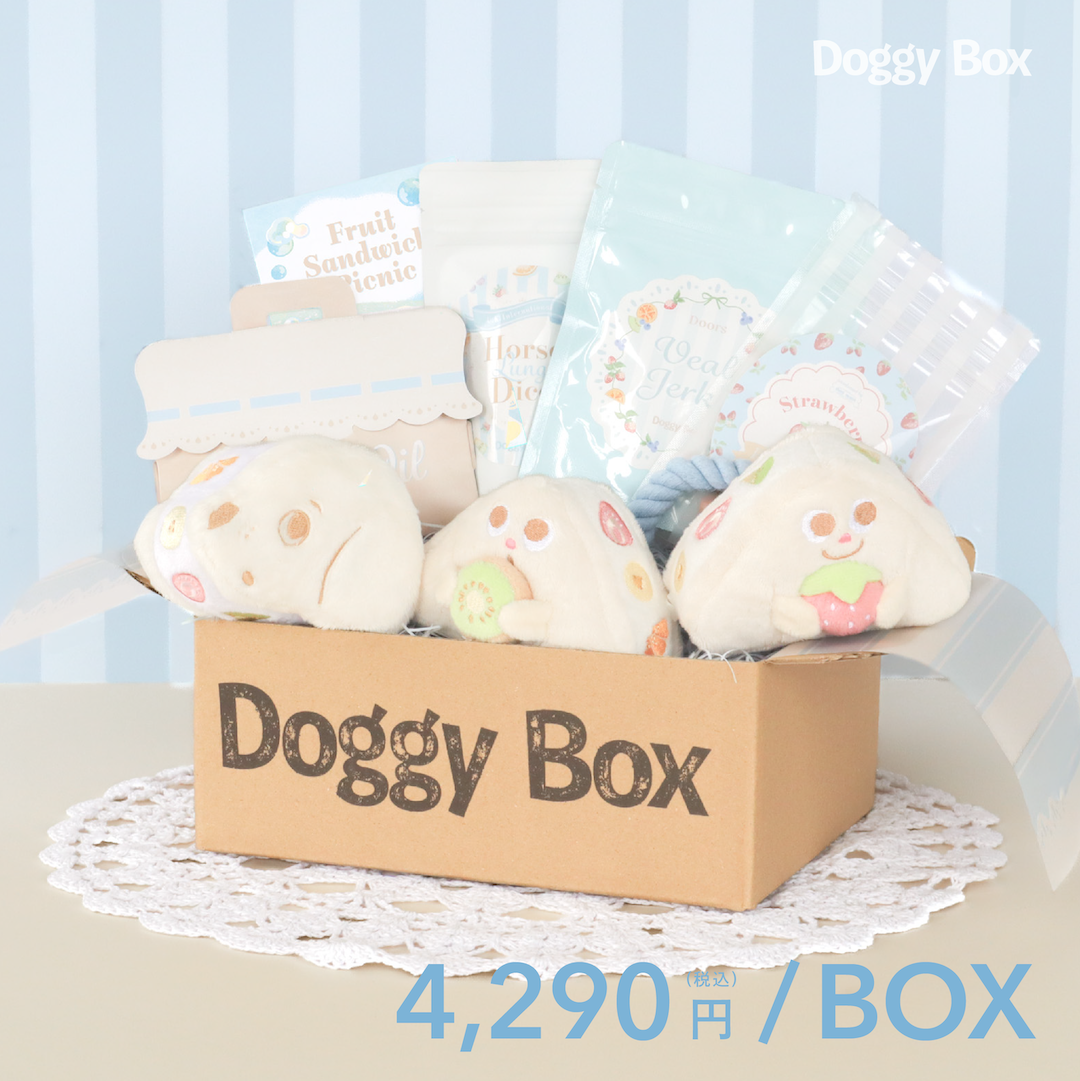 Doggy Boxでは毎月テーマに合わせて楽しいおもちゃと無添加のおやつ、高品質なケア用品をお届けします。