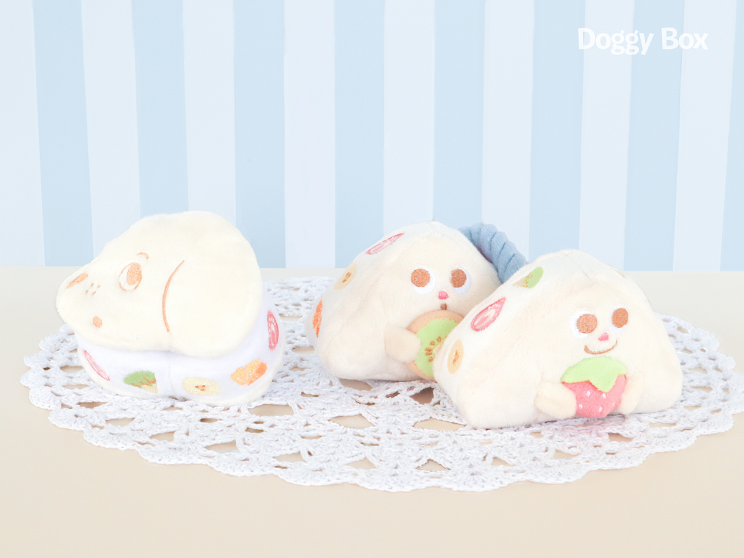 色とりどりの果物をぎゅっと挟んだフルーツサンド、どっちからかじる?ロープで引っ張りっこしたり、犬型のフルーツサンドにおやつを挟んで遊んでも楽しいよ!